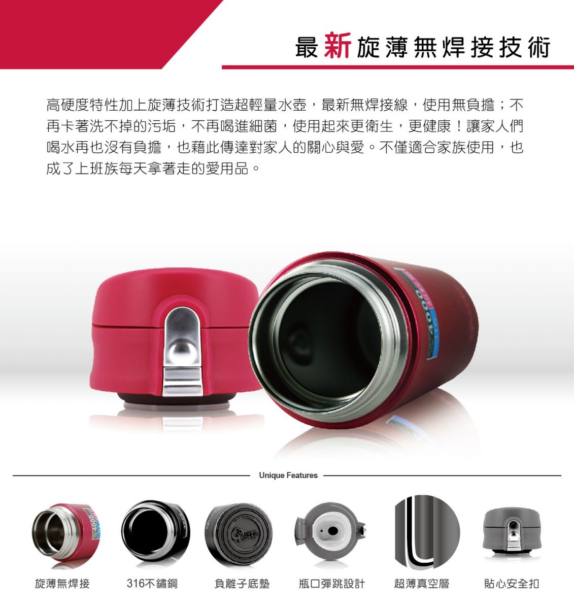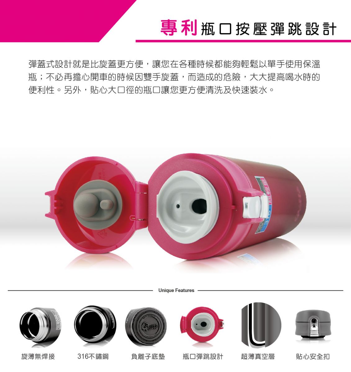 | 瓶身樣式 | 時尚單指彈扣杯蓋設計 保險扣避免誤觸開關 高含量負離子矽膠防滑底墊 |