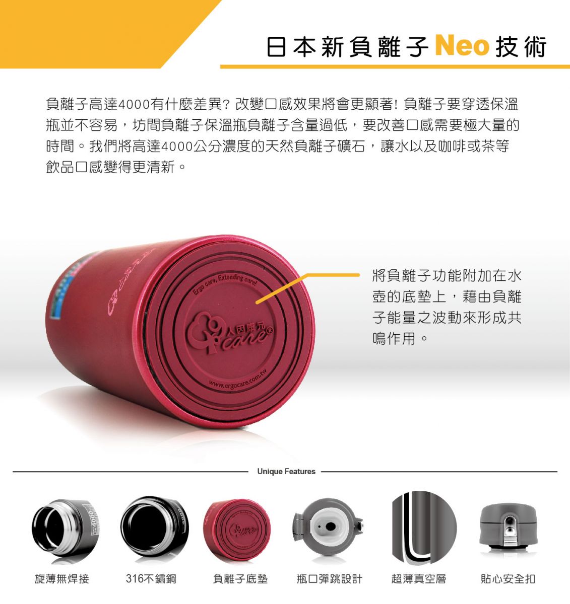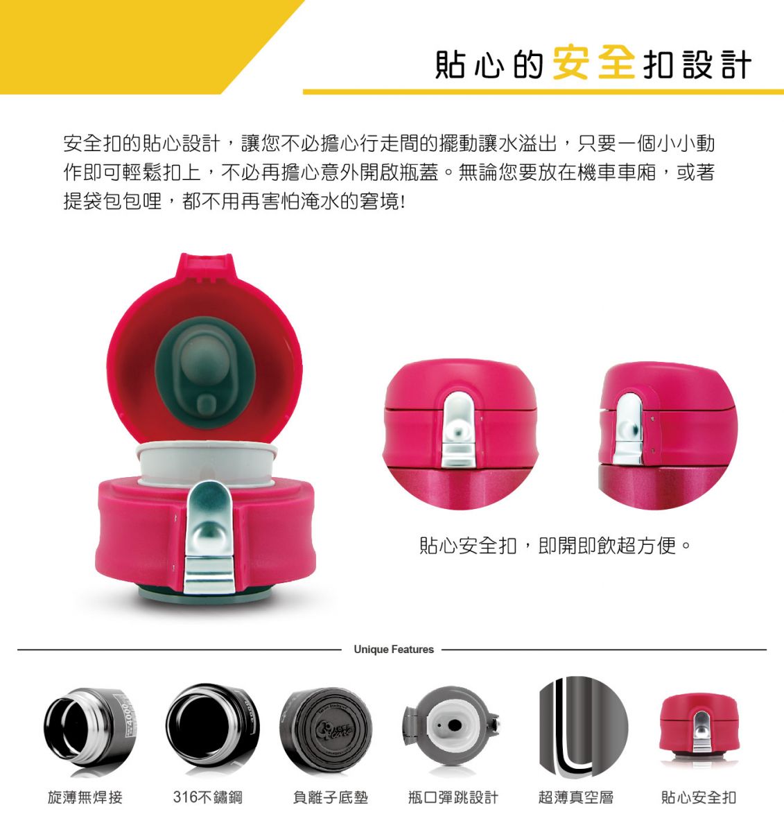 | 瓶身樣式 | 時尚單指彈扣杯蓋設計 保險扣避免誤觸開關 高含量負離子矽膠防滑底墊 |